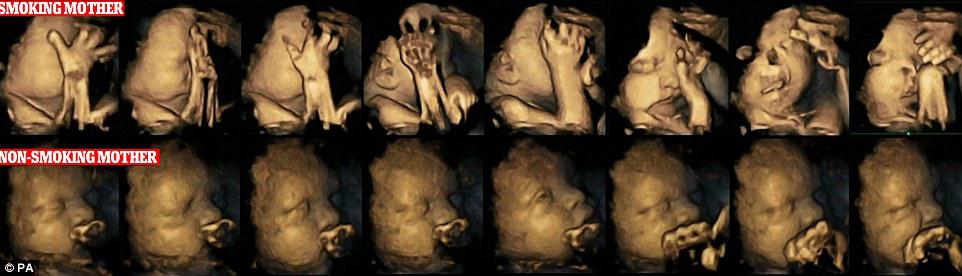 Внутриутробные 4-D УЗИ изображения лица ребенка показывают, как курение во время беременности вредит развитию ребенка в утробе.