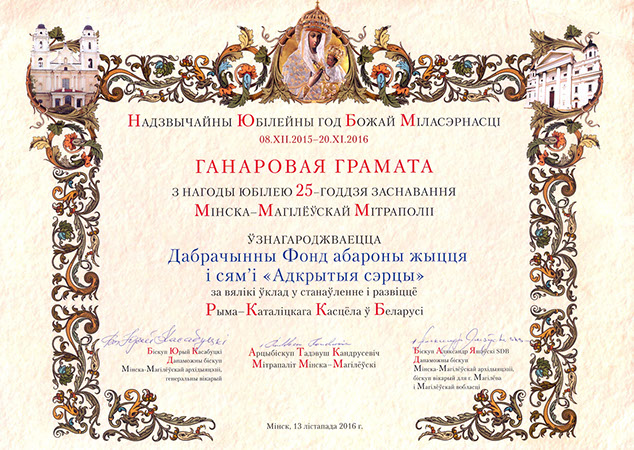 Как раз в канун нового 2017 года Фонд «Открытые сердца» удостоился от Минско-Могилевской архиепархии большой чести – награждения почетной грамотой за большой вклад в становление и развитие Римско-Католической Церкви в Беларуси. Такую высокую оценку наша деятельность получила благодаря всем сотрудникам и волонтерам Фонда. Только совместными усилиями у нас это получилось!
