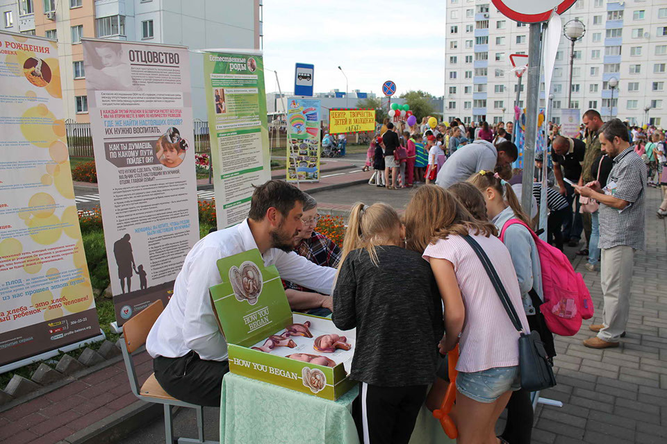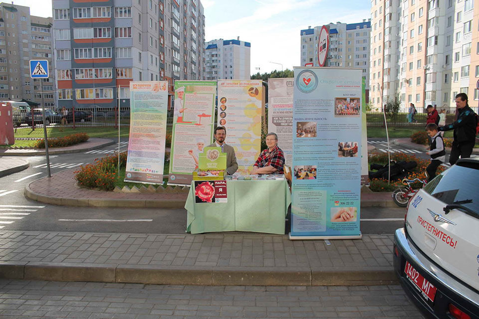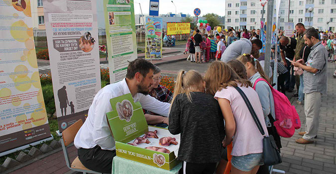Мы воспользовались этой возможностью, чтобы представить некоторые стенды из выставки "Два пути", а также раздавать буклеты и приглашать родителей и их детей на мероприятия, организуемые фондом, в частности, школу для девочек и супружеские бальные танцы. Наш столик пользовался особенной популярностью у детей и их родителей благодаря тому, что была возможность подержать в руках модели эмбрионов на разных стадиях развития и взять бесплатно буклеты и наклейки.
