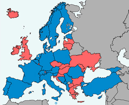 Синим на карте обозначены страны, которые ратифицировали Стамбульскую конвенцию. Красным – страны, которые подписали конвенцию, но еще не ратифицировали.