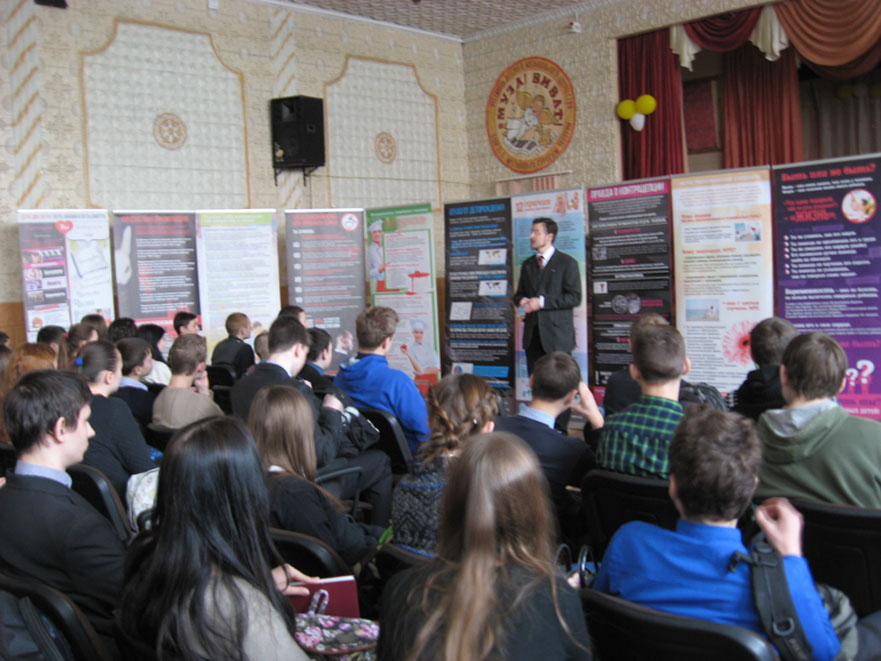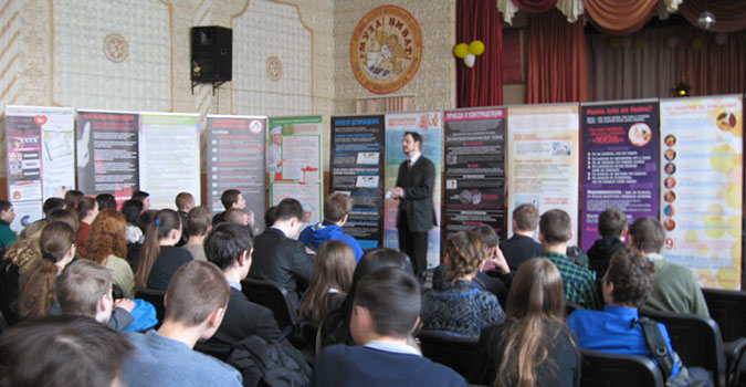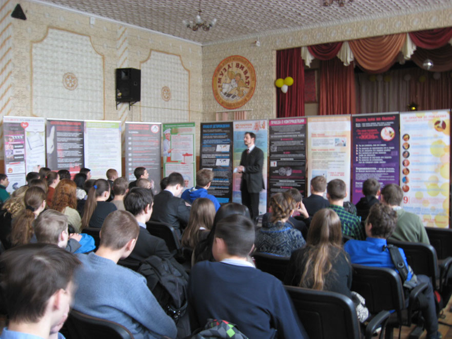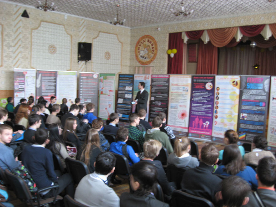 Презентация выставки проходила перед учащимися 9-х и 10-11-х классов. Причем 9-е классы слушали внимательнее, чем их старшие коллеги.