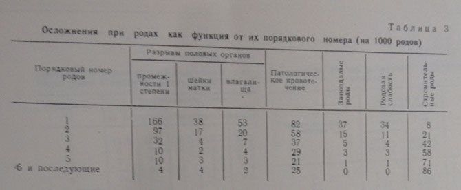 Зависимость осложнений при родах различна для разных ее видов. Наиболее ярко она выражена для такого вида осложнений при родах, как разрывы половых органов (табл. 3).