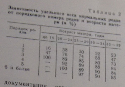 Ухудшение здоровья детей, начиная с 5-го ребенка, не коррелирует с продолжающимся, хотя и медленным, улучшением качества родов. Чем объяснить такую разнонаправленность этих тенденций? Дело в том, что с увеличением порядкового номера родов мать «переходит» в другую возрастную группу, и начинает действовать фактор возраста. Матери возрастной группы 20-24 года имеют самые лучшие показатели оптимальности и по 2-м, и по 3-м, и по 4-м родам. Но удельный вес 5-х родов в этой возрастной группе ничтожен, а 6-х и последующих вообще нет. Наибольший процент 6-х и последующих родов отмечается в возрастной группе 35-39 лет. Но в этой возрастной группе 20-24 года мы видим, что наряду с убыванием патологических родов по вертикали (в табл. 2 сверху вниз) идет убывание и по горизонтали, справа налево, т.е. в направлении уменьшения возраста матери. Суммируя эти два направления, получаем, что самыми благоприятными будут 4-е роды, поэтому дети, родившиеся четвертыми по порядку, имеют лучшие показатели оптимальности, так как они рождаются матерью оптимального возраста.