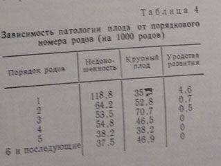 Распределение случаев недоношенности (масса тела новорожденного менее 2500 г), рождения крупного плода (масса тела более 4000 г), врожденных уродств развития также зависит от порядка рождения. Ее максимум приходится на 1-е роды (см. табл. 4).