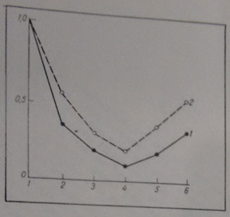 Детская смертность. По оси ординат — численное значение отношения заболеваемости и детской смертности в группах детей, определяемых порядком рождения, к заболеваемости и детской смертности в группе перворожденных ,по оси абсцисс – порядок рождения детей.