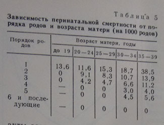 Единственное различие состоит в том, что перинатальная смертность в возрастной группе 30-39 лет минимальна при 4-х родах. В целом, однако, перинатальная смертность, как и осложнения в родах, убывает сверху вниз и справа налево (см. табл. 5).