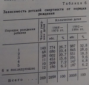 Используя медицинскую документацию о детской (до 1 года жизни) смертности в районе 1973-1987 гг., акты ЗАГС, где указан порядок рождения, мы исследовали зависимость детской смертности от порядка рождения (табл. 6).